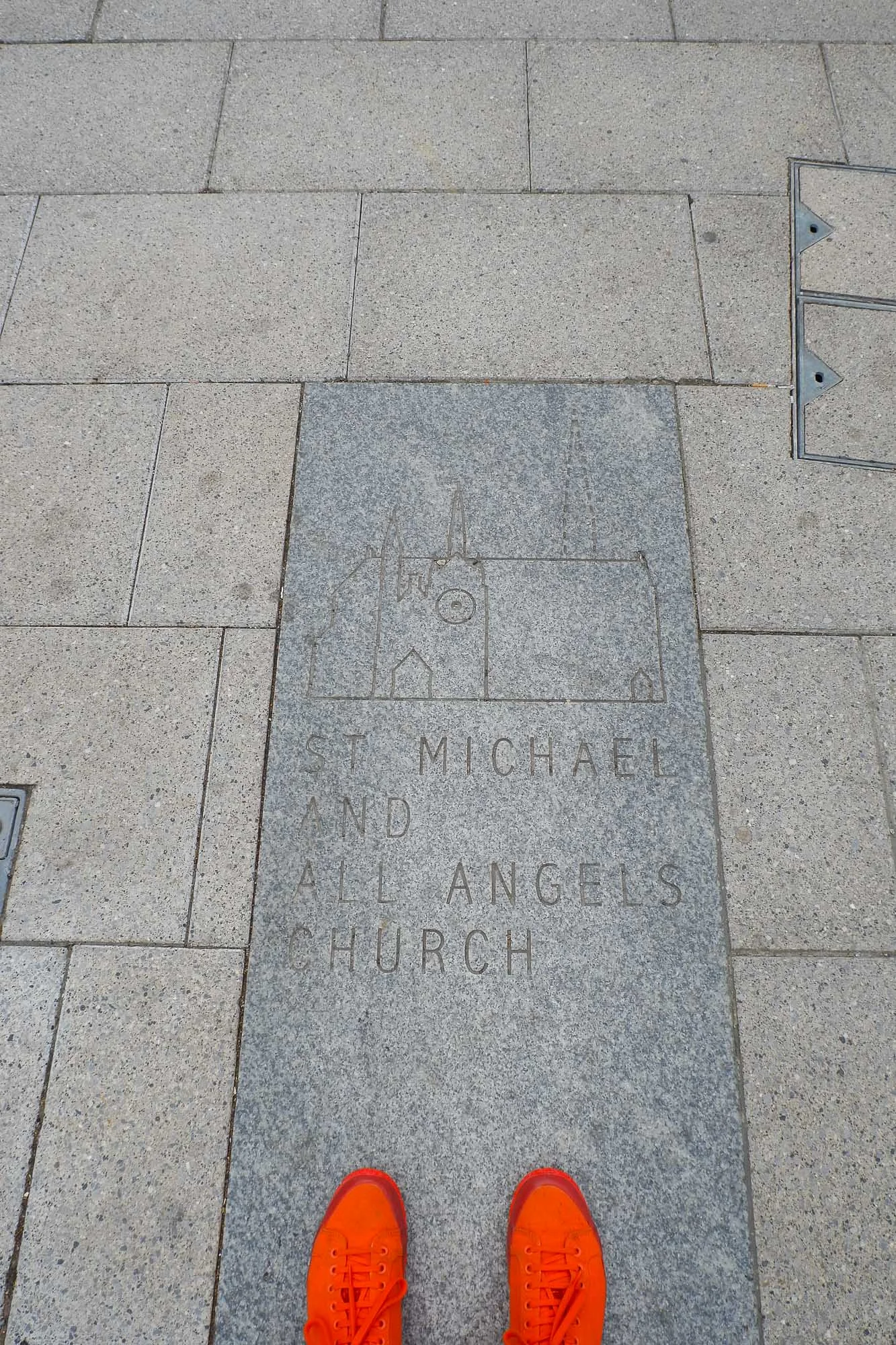 There are lots of things set into the project that tell a story. There is a great church building here, St Michael and All Angels. one of the lovely things about it is that the spire was never built. When they built the original church in the 19th century, they started the first part and then ran out of money! The congregation of the church tell this story, and they're really keen at some point to finish it. That's why East, who were the design team we worked with at West Croydon, dotted in the outline of the spire in an engraving of the church that has been set into the paving.